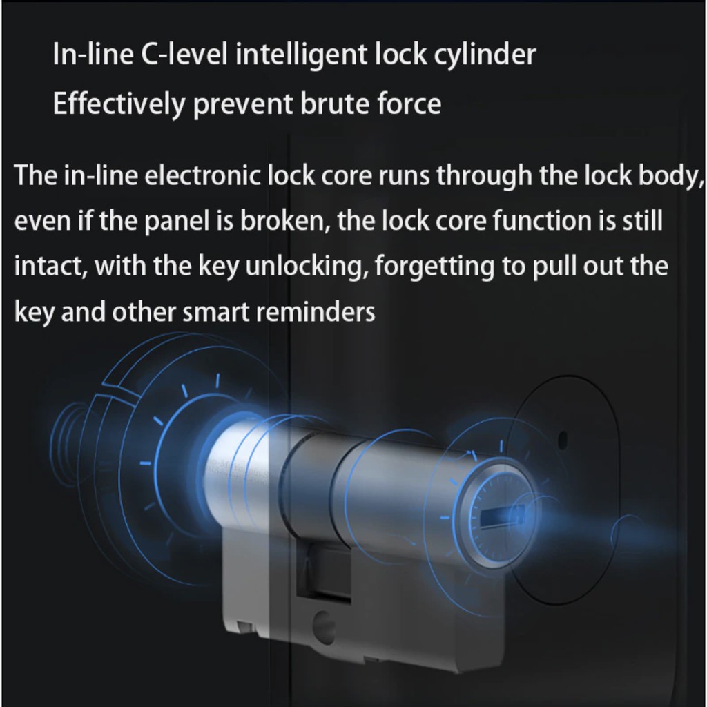 Xiaomi Mijia cửa thông minh khóa tích hợp vân tay module với tay cầm. Sau khi bấm vân tay, những cánh cửa có thể được mở ra trong một bước, và có nhiều mở khóa các phương pháp như mật khẩu, điện thoại di động Bluetooth, chìa khóa cơ, NFC và mật khẩu tạm thời.