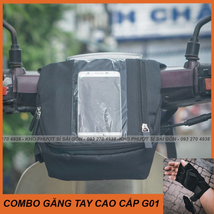 Kho Sỉ SG - Bộ túi treo đầu xe máy cảm ứng điện thoại được kèm găng tay cụt ngón SWAT G01 - Túi Grab treo đầu xe dọc cảm
