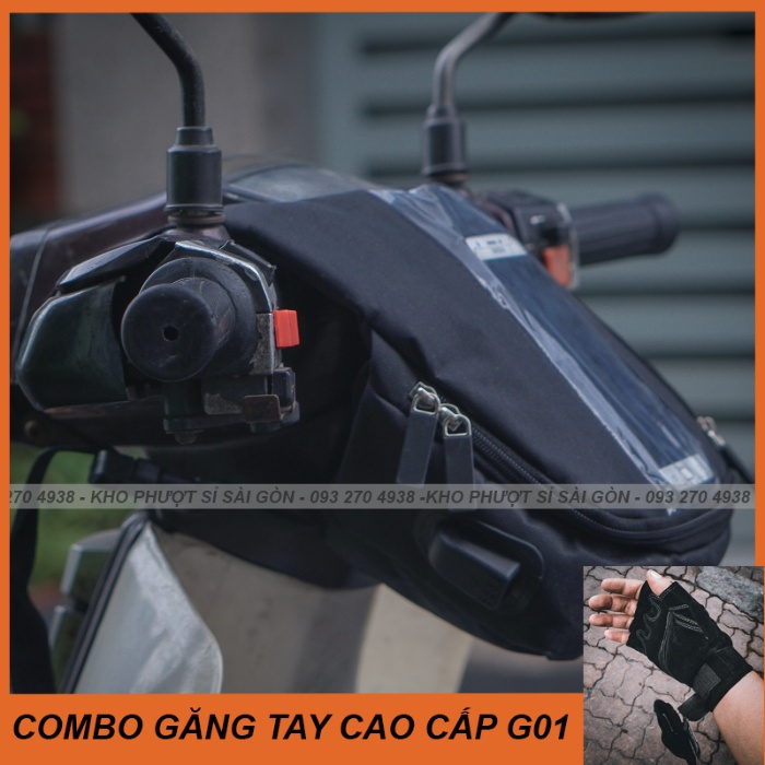 Giới thiệu Kho Sỉ SG - COMBO GRAB túi treo đầu xe máy chạy Grap cảm ứng điện thoại kèm găng tay Swat G01 đen - Túi dọc treo đầu xe