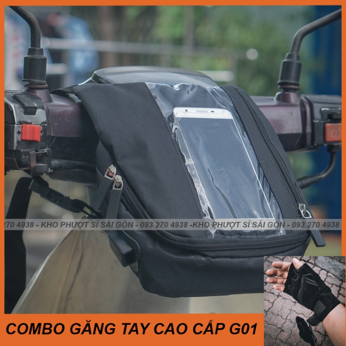 Giới thiệu Kho Sỉ SG - COMBO túi Grap treo đầu xe máy dạng dọc cảm ứng được điện thoại kèm găng tay G01 - Túi treo dọc đứng đầu xe