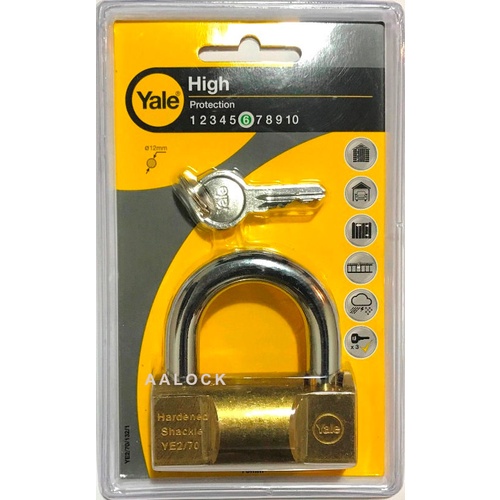Khóa bấm Yale YE2/70/132/1, dòng hammer- loại khóa cao cấp của hãng Yale (Mỹ)- Thân khóa rộng 70 mm. Khoảng trống bên trong càng khóa: rộng 38mm, cao 32mm. Đường kính càng khóa: 12 mm