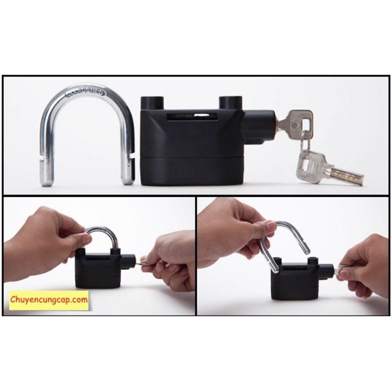 - Hướng dẫn sử dụng: Bỏ chìa khóa vào và vặn sang trái để lấy càng khóa ra. Khóa có 2 chế độ khóa bình thường và khóa báo động. Khóa bình thường khi nhấn càn khóa xuống không có tiếp bíp, còn nếu nhấn càn khóa xuống mà có tiếng bíp là đã trong chế độ báo động. Để tắt báo động thì phải bỏ chìa khóa vào và lấy càng khóa ra