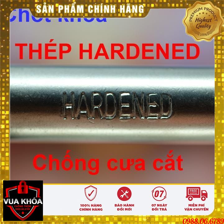 - Gọng khóa bằng thép HARDENED nổi tiếng siêu cứng, có khả năng chống cưa cắt rất tốt. Đặc biệt gọng khóa có đường kính lên đến 14cm kết hơp với thép HARDENED – với Size này kìm công lực thông thường không thể cắt nổi.