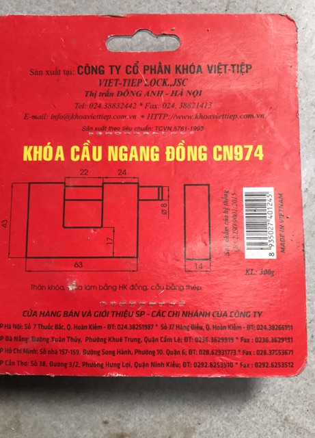 Khoá cầu ngang Việt Tiệp CN974 chính hãng hàng Việt Nam chất lượng cao.- Trọng lượng: 300g