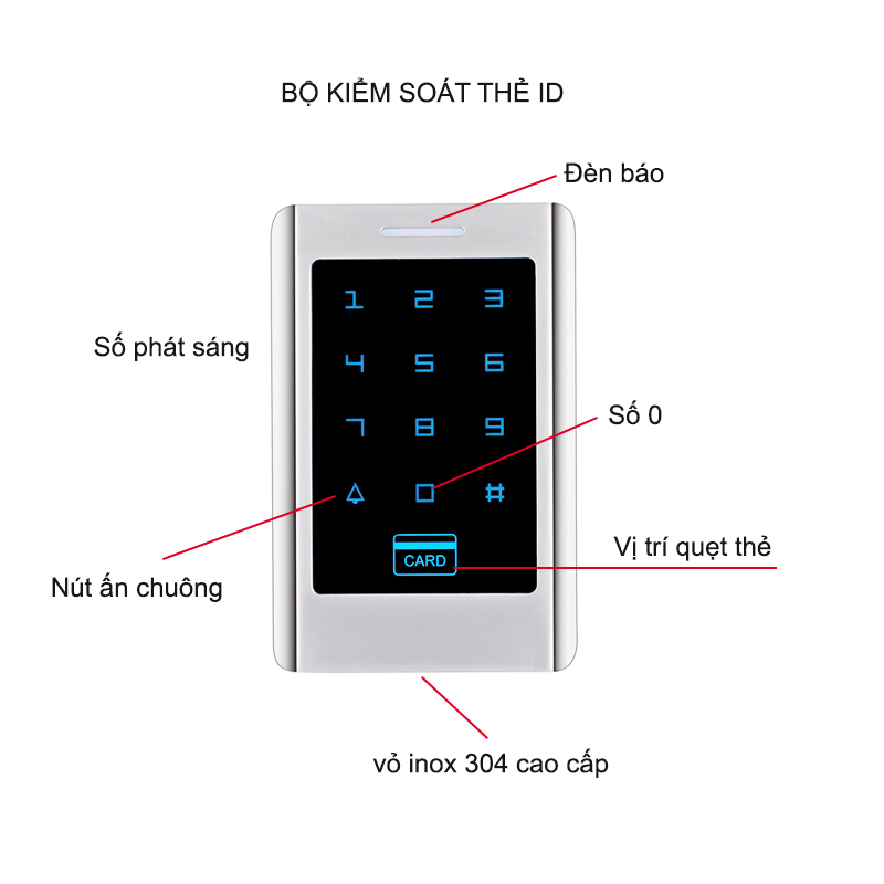 + cổng kết nối: +12V; GND (-12V); Push; Open; chuông; Rơ le (NO, COM, NC)