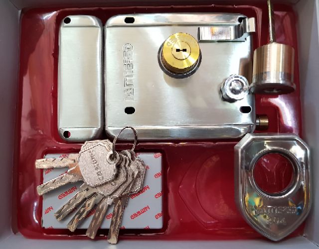 #Khoacuacongrao#hamered# . Khoá cổng hamered với vỏ ngoài hoàn toàn bằng inox 304 , kết cấu củ chìa và núm vặn bằng chất liệu đồng .Số lượng chìa là 6 ( chất liệu đồng , chìa khoá cao cấp chống trộm ) .