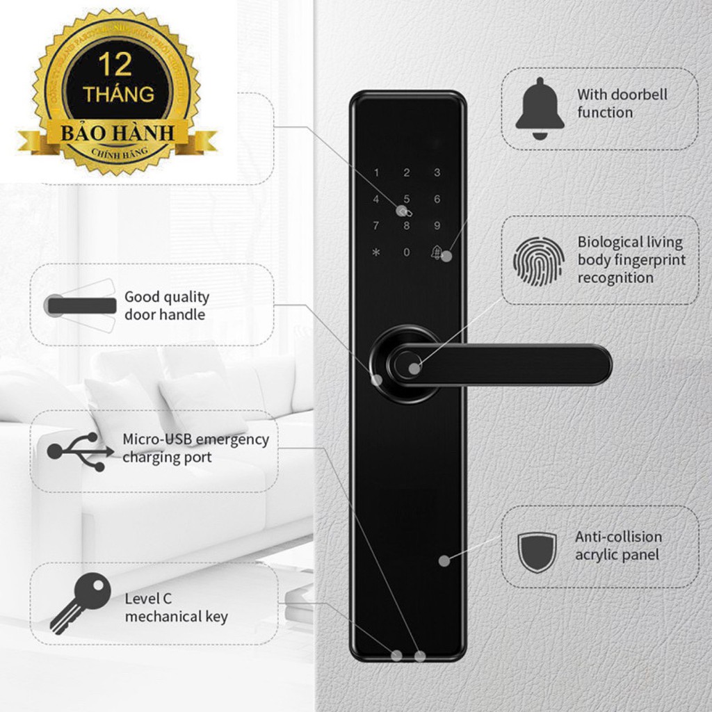 -Vân tay nhạy, bàn phím ảo chống nhìn trộm mật mã, cảnh báo khi hết pin hoặc đăng nhập sai mật mã.