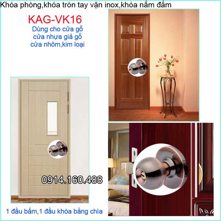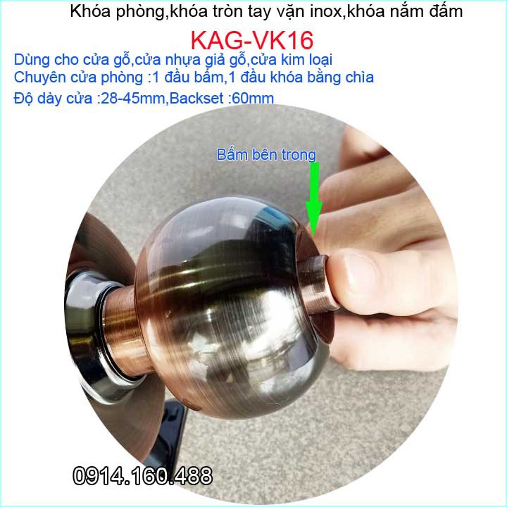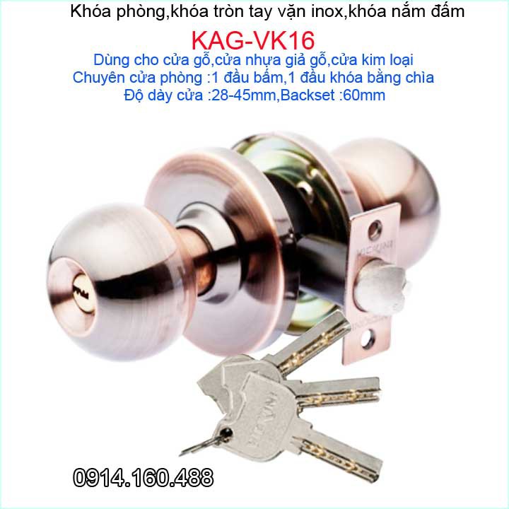 Khóa cửa phòng cao cấp màu nâu đồng, khóa tay nắm tròn, khóa phòng ngủ Vickini KAG-VK16Chất liệu: Khóa cửa phòng tay gạt, khóa cửa Vickini KAG-VK16 sản xuất bởi chất liệu Inox mờ sang trọng, thiết kế đẹp,