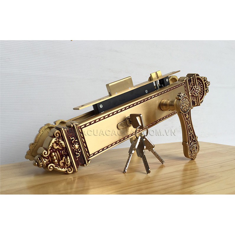 Tay ốp khóa được sản xuất từ đồng vàng (đồng thau) bằng công nghệ đúc chân không tiên tiến, giúp cho tay ốp khóa dầy dặn, chắc chắn, hoa văn họa tiết tinh tế, sắc nét