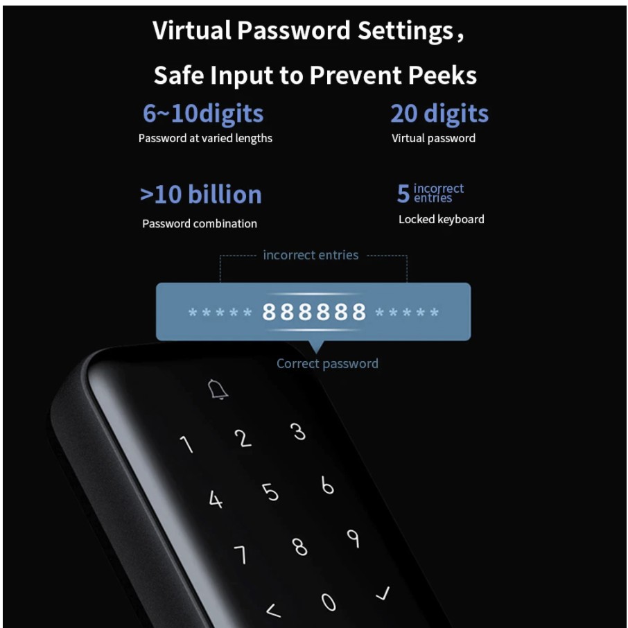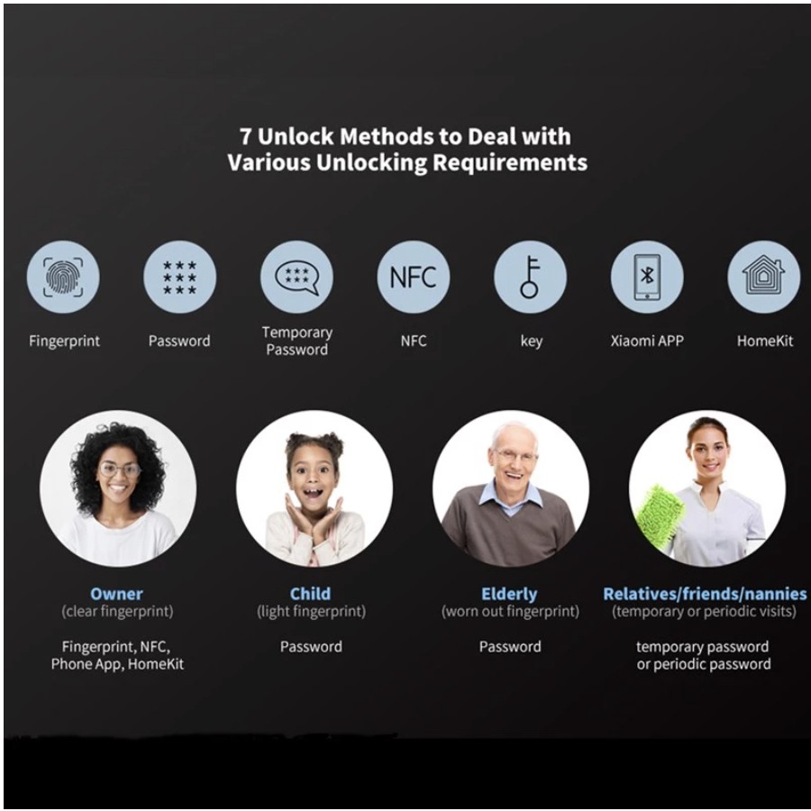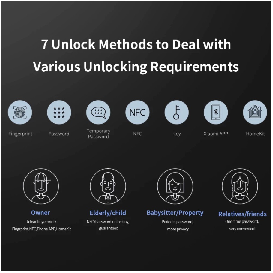 Mở khóa bằng Vân Tay, mật mã, mật khẩu tạm thời, chìa khóa cơ, NFC (Chỉ hỗ trợ bởi Xiaomi điện thoại, mi Band 4, mới nhất đồng hồ), điện thoại di động Bluetooth, HomeKit.