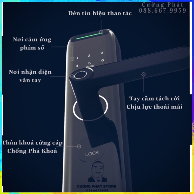 *Phương thức mở khoá : Vân tay, thẻ từ, chìa khoá, Mật mã, Điện thoại.