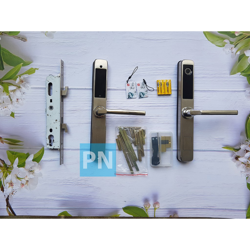 - Bao gồm: Khóa vân tay 2 mặt, thân khóa 3585 (lùa hoặc đẩy), 02 thẻ từ, 04 viên pin aaa, khóa cơ 2 chìa, ốc vít.