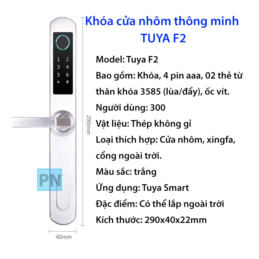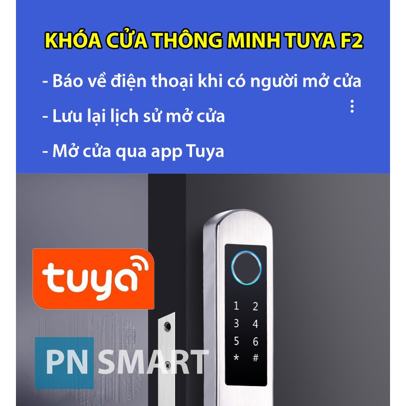 - Khóa cửa nhôm thông minh TUYA F2 là sản phẩm mới với nhiều tính năng hiện đại, bạn có thể dễ dàng kiểm soát hoạt động ra vào ngôi nhà của mình qua vân tay, mã số, thẻ từ và app Tuya Smart trên điện thoại