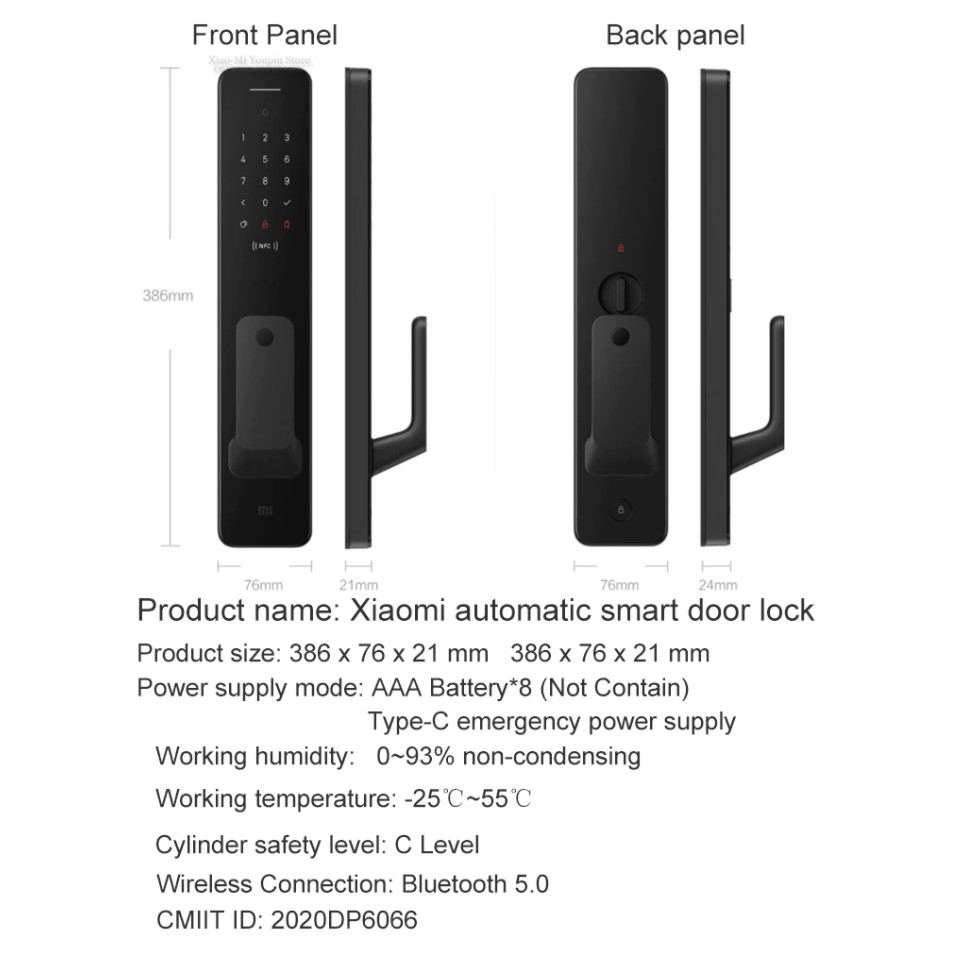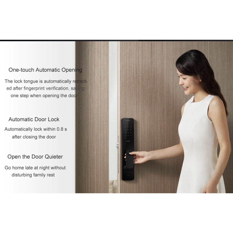 Khóa cửa thông minh tự động Xiaomi chủ yếu có màu đen tổng thể trông rất cao cấp. Nó sử dụng quá trình phun điện di, có thể giữ cho bề mặt của khóa cửa không dễ rơi ra. Nó sử dụng lõi khóa cấp độ C, ngay cả khi bảng điều khiển bị hư hỏng cũng không thể mở khóa được. Bên trong thân khóa sử dụng một hệ thống điện tuyến tính sáng tạo bao gồm lực truyền động tuyến tính, giảm bánh răng hành tinh, công suất động cơ vi mô, cảm biến trạng thái và các thành phần khác, đồng thời tự động mở rộng và co lại bu lông nhanh hơn và ổn định hơn khi làm việc.