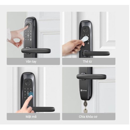 – Mở cửa: Vân tay, Mật khẩu, Thẻ từ (Thẻ CPU), Chìa cơ.