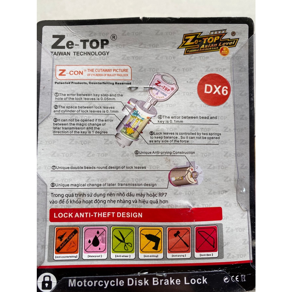 Khoá đĩa xe máy Z-Con DX6 loại cao cấp chính hãng, khoá chống trộm xe máy, xe đạp công nghệ Đài Loan, chống đập phá, cưa- Ổ khóa thắng đĩa xe máy Z-Con, chống trộm an toàn cho "xế yêu". Khóa giúp bảo vệ an toàn tuyệt đối cho tài sản của bạn đồng thời giúp bạn an tâm hơn trong lúc làm việc hay trong giờ nghỉ ngơi.