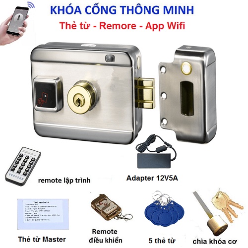 - Bộ khóa bao gồm: 1 thân khóa chính, 1 Remote điều khiển, 1 bàn phím thao tác, 1 thẻ master, 5 thẻ móc khóa, 3 chìa cơ ,Adapter 12V-3A và APP mở cửa từ xa