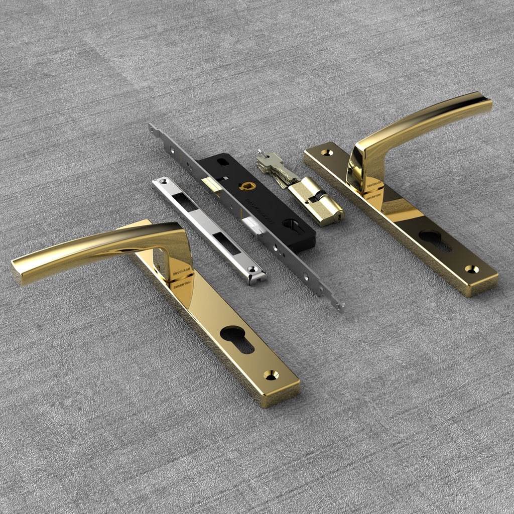 Tay ốp khóa được sản xuất bằng vật liệu đồng vàng (đồng thau), mạ PVD Gold.