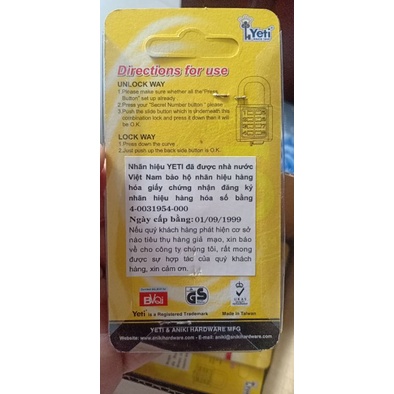 Nhà cửa & Đời sống > Bảo hộ gia đình > Khóa, ổ khóa || Khoá số Yeti 35mmCòn hàng