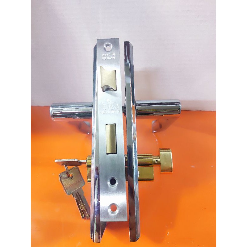 Tay ốp khóa được sản xuất bằng hợp kim ZDC-2, mạ Ni + Cr.Thân khóa được sản xuất bằng tôn thép với độ dày 1,5mm được phủ một lớp sơn tĩnh điện. Then khóa làm bằng đồng vàng (đồng thau) có kết cấu chắc chắn, an toàn. Tất cả chi tiết khác bên trong thân khóa được làm bằng tôn thép mạ Zn theo tiêu chuẩn quốc tế.