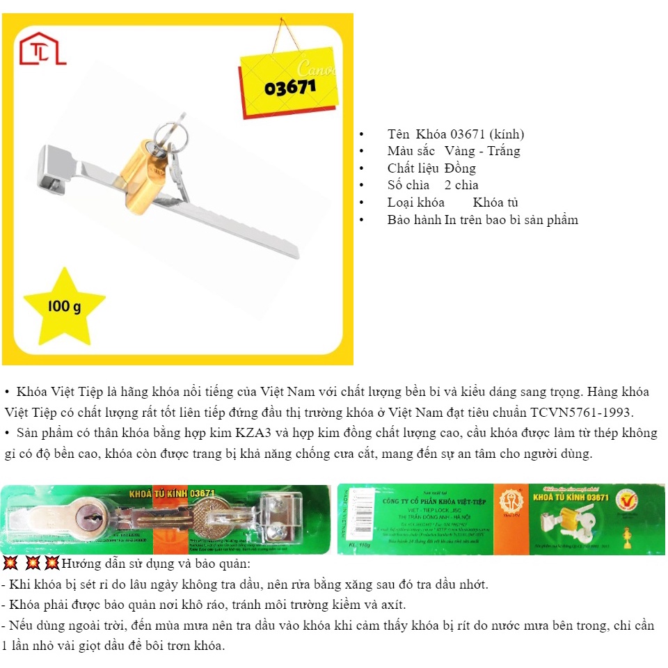 Khóa tủ kính Việt Tiệp 03671Khóa Việt Tiệp là nhãn hiệu khóa nổi tiếng của Việt Nam, hàng Việt Nam chất lượng cao nhiều năm liền. Hàng Việt Tiệp thì quá nổi tiếng rồi, không cần giới thiệu nhiều nữa ạ.