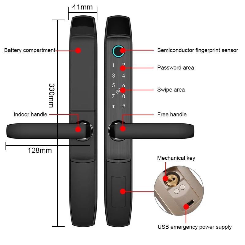 Tính năng: Nguồn dự phòng USB khẩn cấp / Chống thấm nước / Mật khẩu/ Vân tay/ thẻ từ/ chìa khóa cơ/ App Tuya
