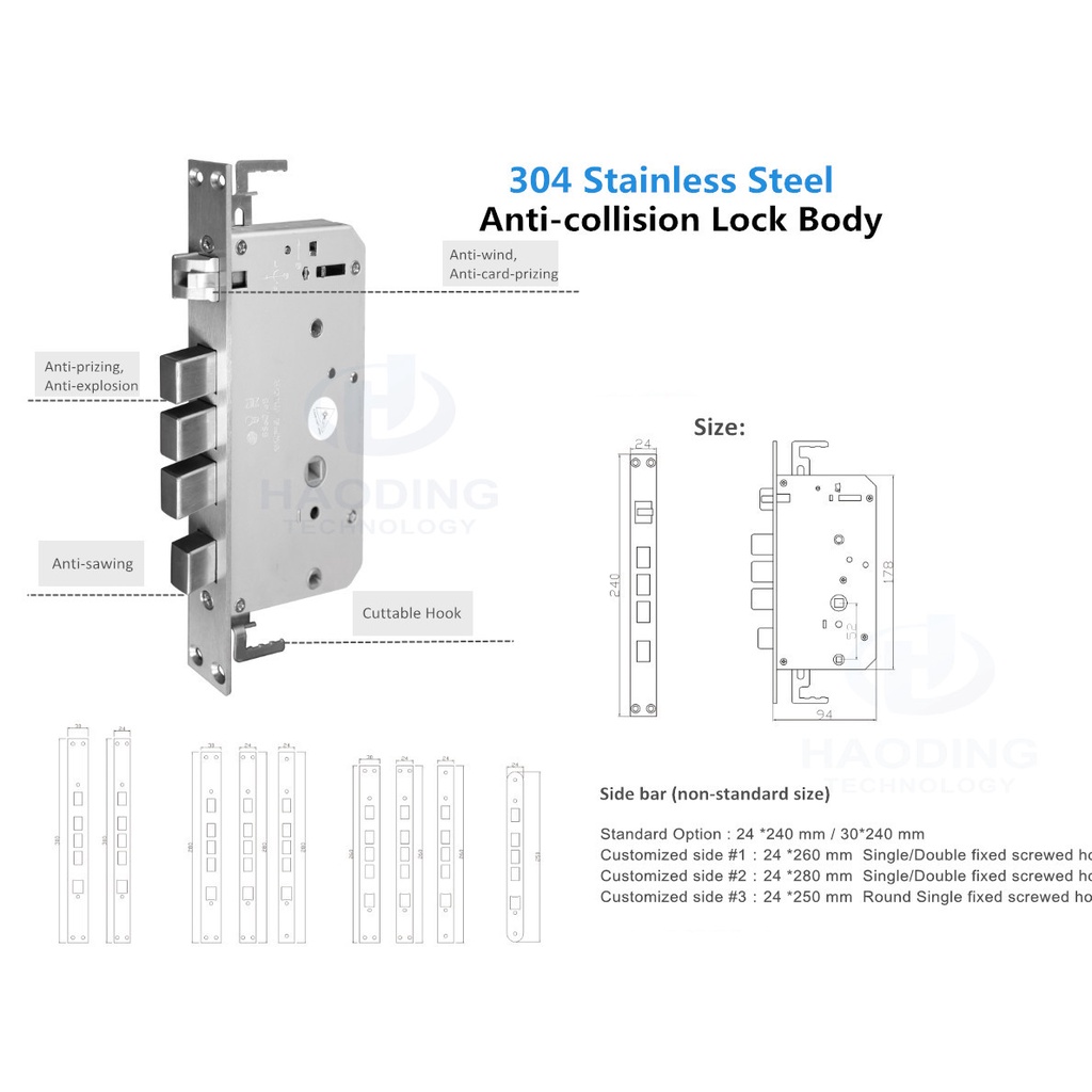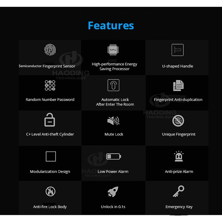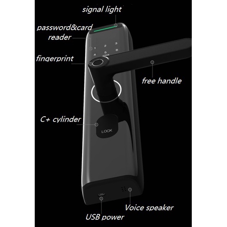 6V DC (4 pin 1.5V AA Alkaline), trong trường hợp khóa mất nguồn hoặc bạn không thể mở bằng vân tay hoặc mã số, bạn có thể sử dụng chìa khóa cơ từ bên ngoài để mở khóa trực tiếp.