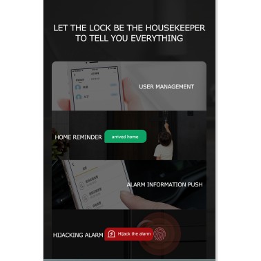 - Khóa dạng vân tay kết hợp wifi theo dõi trạng thái và liên kết các thiết bị khác trong app. Nhận biết được từng người và lưu vào bộ nhớ lịch sử đăng nhập trên điện thoại.