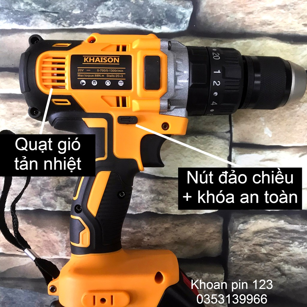 Nhà cửa & Đời sống > Dụng cụ & Thiết bị tiện ích > Dụng cụ > Máy khoan, máy vặn vít & phụ kiện || Khoan pin đầu kẹp 13mm Khaison chính hãng, pin chuẩn 10cell 4A (có búa)Còn hàng
