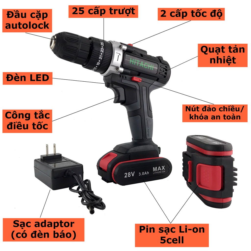 Khoan pin HITACHI 28v có búa bộ 2 pin đầy đủ