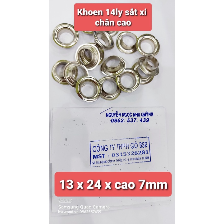 Khoen mắt cáo 14ly: đường kính trong 13mm x Vành ngoài 24mm x chân cao 7mm