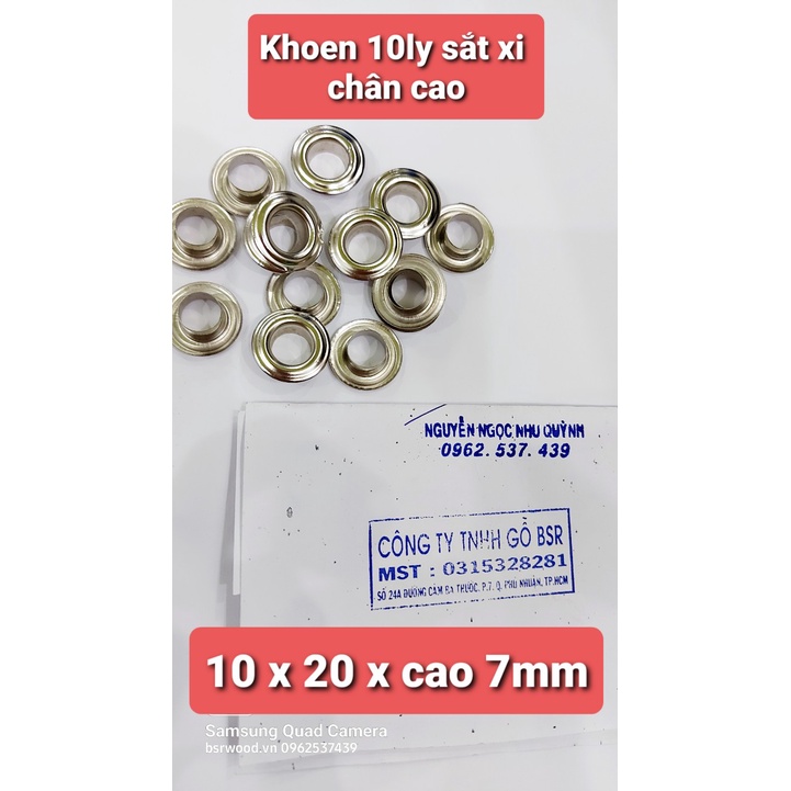 Khoen mắt cáo 10ly: đường kính trong 10mm x Vành ngoài 20mm x chân cao 7mm