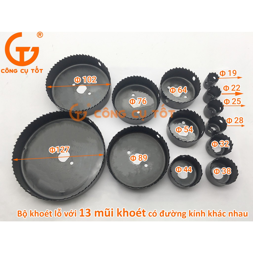 Các lưỡi khoét có đường kính:19mm, 22mm, 25mm, 28mm, 32mm, 38mm, 44mm, 54mm, 64m, 76mm, 89mm, 102mm, 127mm