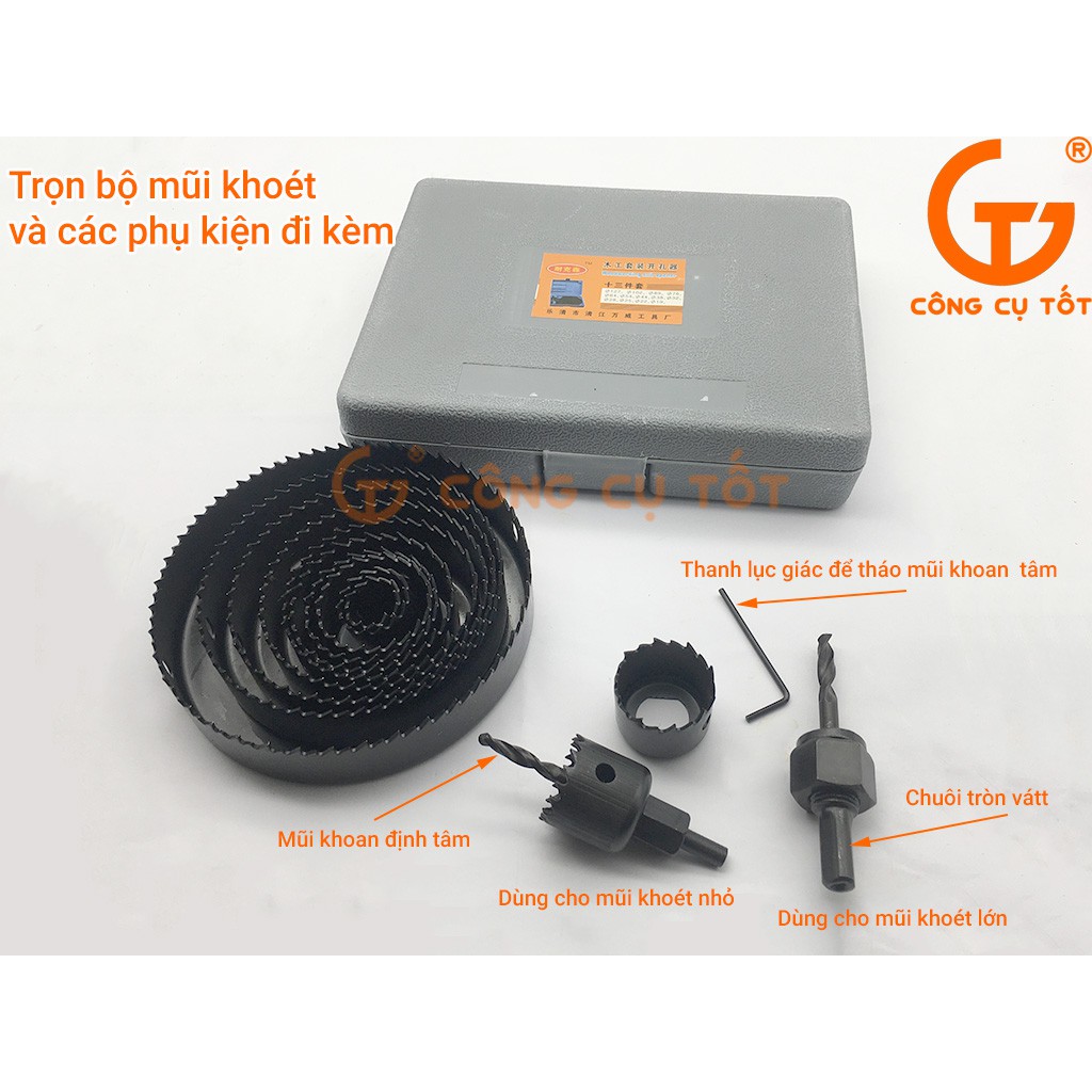 Bộ sản phẩm gồm 13 đầu khoét lỗ gỗ, thạch cao, 2 đầu nối mũi khoan trục trung tâm và 1 chìa lục giác