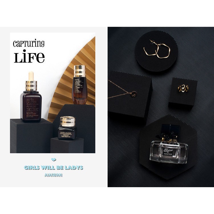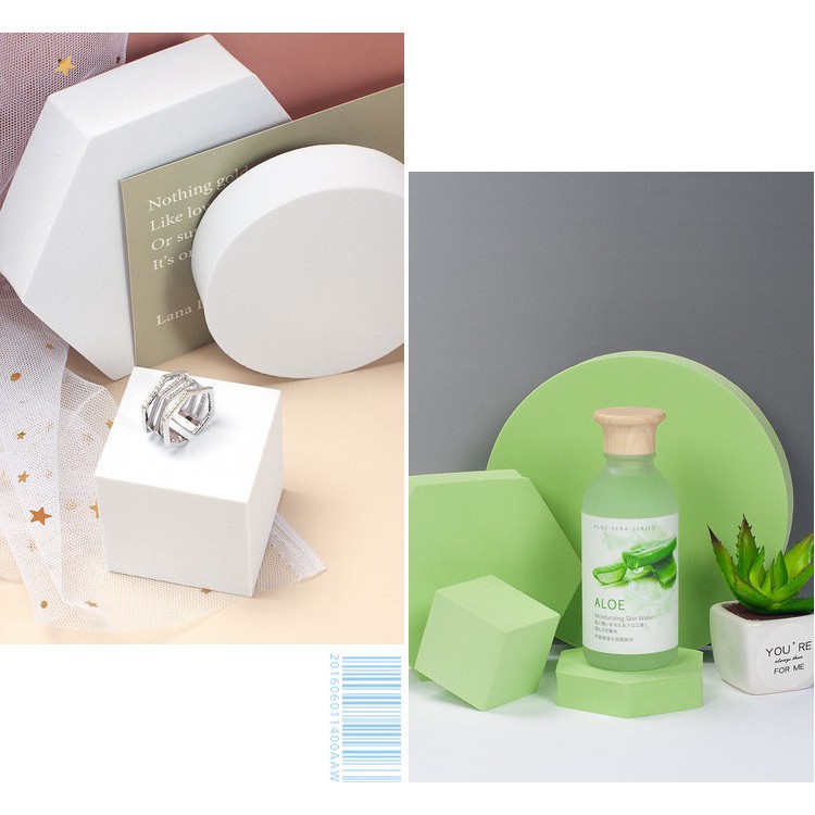 Khối hình học phù hợp khi chụp với các sản phẩm nhỏ như: Mỹ phẩm, trang sức, nước hoa, son môi, mắt kính, đồng hồ. Có thể kết hợp cùng các loại phông nền và phụ kiện như tấm gương, tượng, hoa, lá..