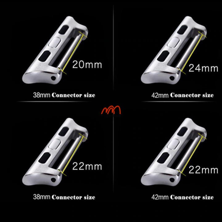 Bộ Khớp Nối - Đầu chuyển dây đồng hồ Apple Watch được làm từ chất liệu thép. Có kích thước: 20mm, 22mm và 24mm. Các đầu nối chắc chắn - dẻo dai, màu sắc phù hợp theo đồng hồ Apple Watch mà Quý Khách đang sử dụng, giúp tăng tính thẩm mỹ cho sản phẩm.