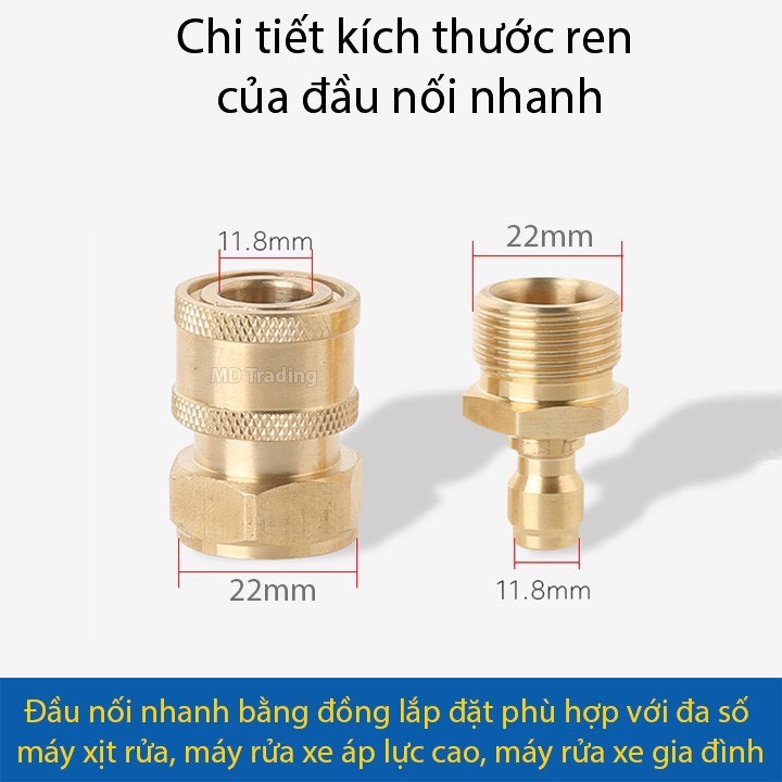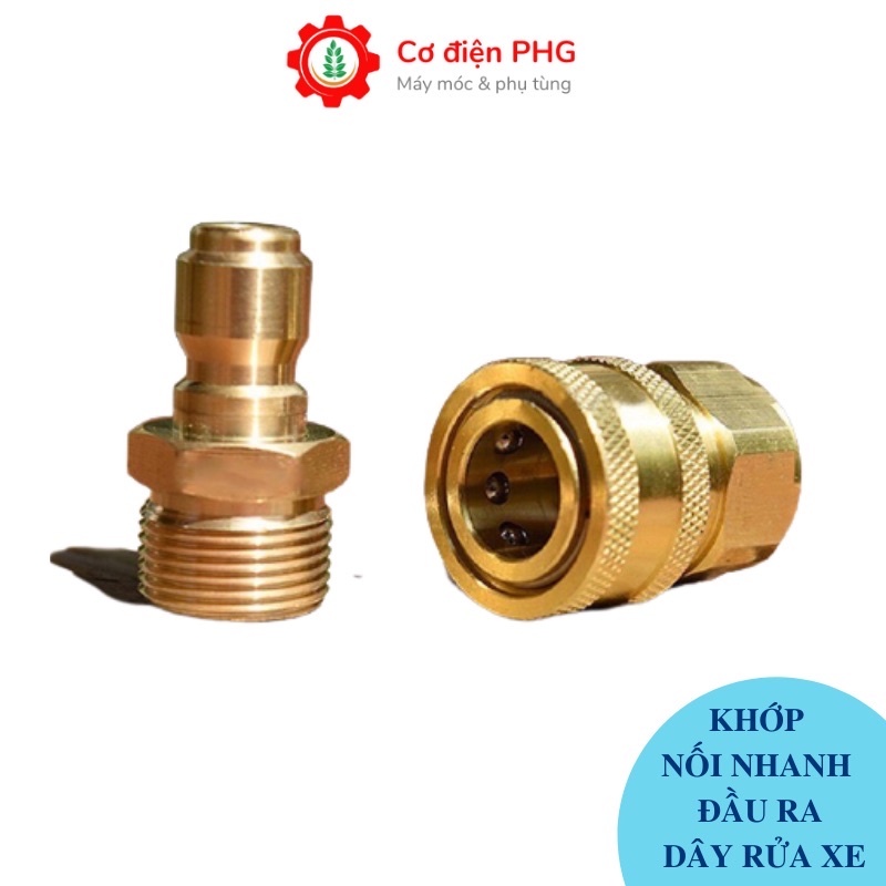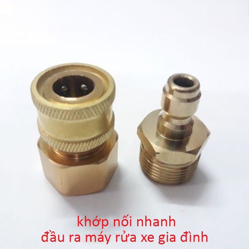Bộ khớp nối nhanh đầu ra cho máy rửa xe áp lực cao, đầu nối nhanh đầu ra cho máy xịt rửa cao áp, máy rửa xe gia đình, máy bơm rửa xe mini 220V (chống xoắn dây 22mm, nối súng với béc và bình bọt tuyết)Nếu việc trước đây để tháo lắp dây phun xịt áp lực cao với máy vô cùng khó khăn, bất tiện. Bạn muốn di chuyển linh hoạt hoặc cất dây xịt rửa gọn gàng khi không sử dụng đến, với đầu nối cũ khi đã vặn rất khó để tháo, có nguy cơ bị chờn ren không như ban đầu. Mọi việc tưởng chừng bất khả thi. Nhưng nay đã khác, với khớp nối nhanh chúng tôi giới thiệu ở đây thì mọi việc vô cùng dễ dàng hơn bao giờ hết. Khớp nối nhanh bằng đồng, thiết kế thông minh, tháo lắp linh hoạt bằng hệ thống bi ngàm giữ chịu áp lực cao, kết nối chắc chắn, không bao giờ có hiện tượng rò nước.