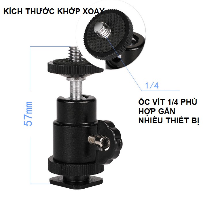 - Khớp xoay có ốc 1/4 phù hợp gắn nhiều thiết bị như máy ảnh, máy quay hành động gopro, action camera