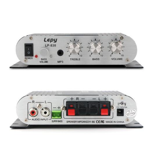 Đây là bộ âm ly mini LP-838 thiết kế rất gọn gàng và chỉ cần nguồn 12V-2A nhưng amply lại cho công suất âm thanh khá lớn, có thể kéo tốt các bộ loa công suất 30W/1 kênh.Sử dụng IC công suất TDA7057, amply cho âm thanh chi tiết, âm bass khá tốt. Có đường ra Sub-out dành cho loa subwoofer, hỗ trợ các dòng loa công suất tới 40W.