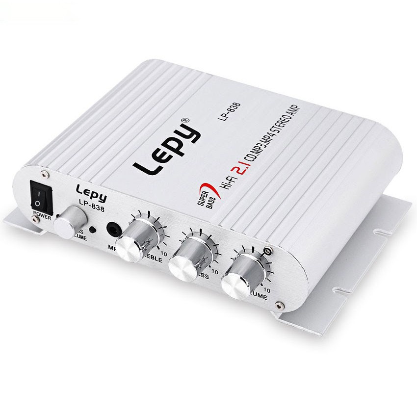 Bộ Khuếch Đại Âm Thanh Lepy LP-838 2.1CH 2A Vỏ Nhôm Bền Chắc, Kết Nối Dễ Dàng Với Nhiều Thiết BịAmpli mini công suất Lepy LP-838 12V Hi-Fi 2.1 là bộ khuếch đại âm thanh nhỏ gọn dành cho xe hơi, xe máy hay phòng nghe nhạc gia đình.