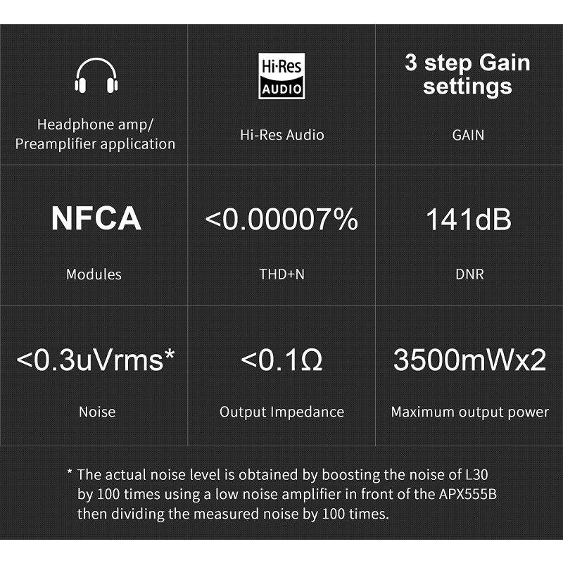 Topping L30 sử dụng modules NFCA(Nested Feedback Composite Amplifier), đây cũng chính là modules được sử dụng trên chiếc Topping A90 đầu bảng của hãng. Kiến trúc phản hồi lai dòng điện áp cùng với công nghệ UHGF() cung cấp hiệu xuất dòng điện DC và AC tốt. Khả năng dẫn động dòng điện đầu ra cao cho phép chiếc L30 có thể điều khiển những chiếc tai nghe có trở kháng thấp một cách dễ dàng. Độ nhiễu nền cực thấp chỉ với 0.3uV và độ động cao lến tới 141 dB, giúp Topping L30 có thể phối ghép dễ dàng với những chiếc IEM có độ nhạy cao.