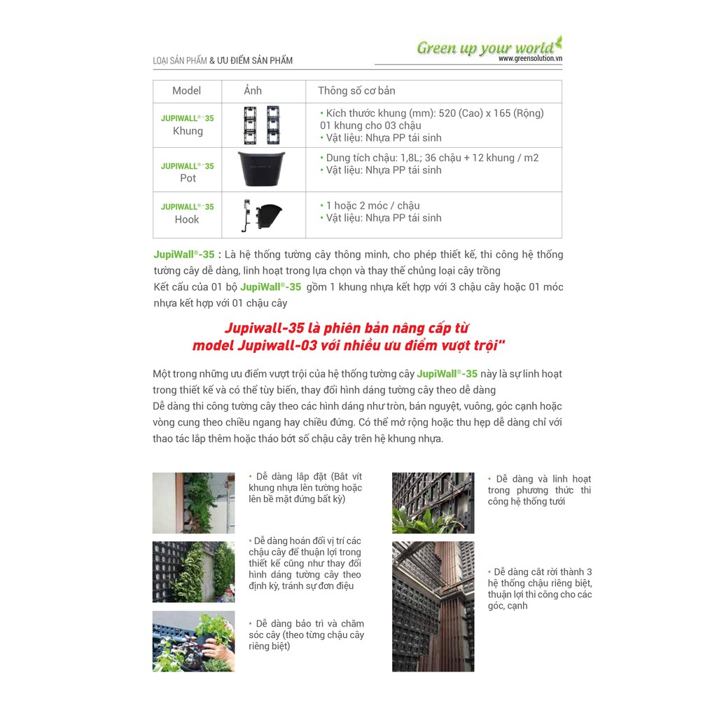 Jupiwall-35: Là hệ thống khung chậu tường cây thông minh, cho phép thiết kế và thi công hệ thống tường cây một cách dễ dàng và linh hoạt trong lựa chọn thay thế chủng loại hoặc bảo dưỡng cây trồng, kết cấu của 1 bộ module gồm 1 khung đỡ kết hợp với 3 chậu cây hoặc 2 móc nhựa kết hợp với 1 chậu cây (trong lựa chọn khung thép).Các thông số cơ bản của Jupiwall-35: