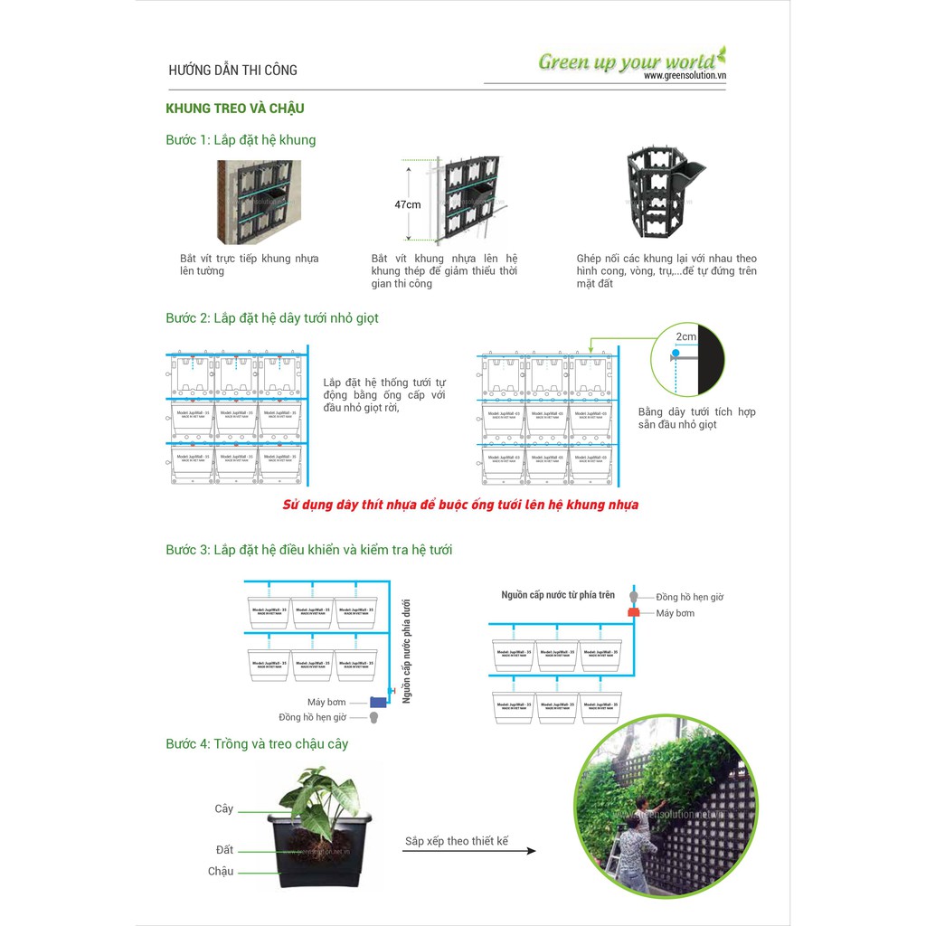 Lấy lần lượt các hộp chậu nhựa gài vào khớp với khung đã cố định trên tường, để dễ dàng nên lắp đặt chậu lần lượt từ dưới thấp lên trên.