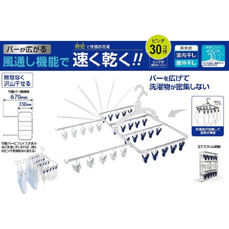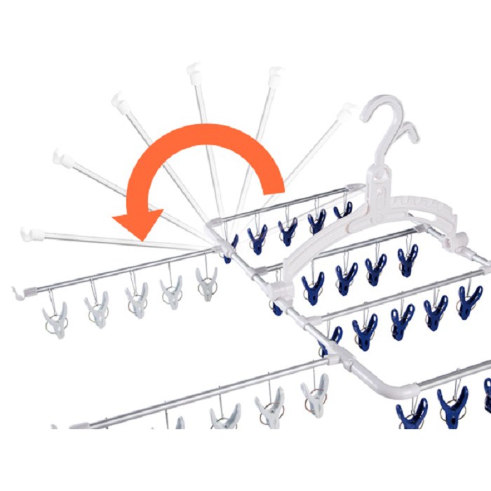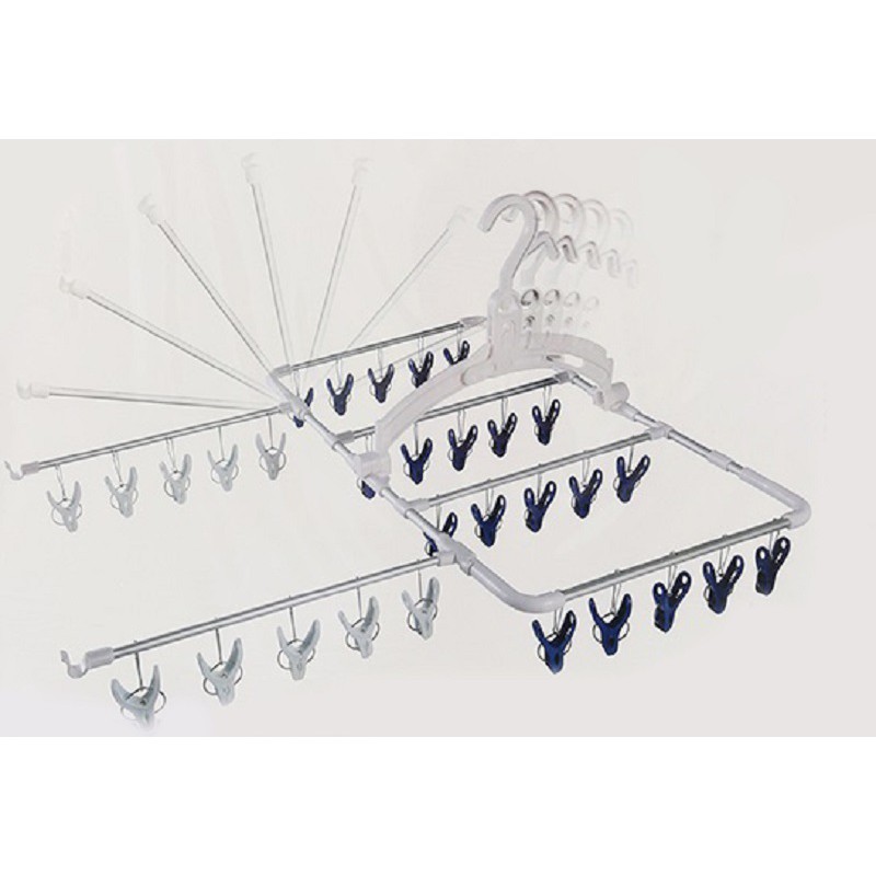 Khung khơi gồm 30 kẹp giúp quần áo, tất, tã, đồ lót... luôn được phơi gọn gàng, chắc chắn và có thể treo móc ở mọi không gian. Phần kẹp giữ có các đường răng cưa mịn, tròn, bảo đảm không làm hư hỏng trang phục, mang lại sự thuận tiện tối đa cho người sử dụng.