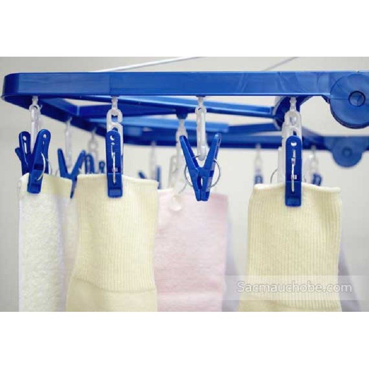 - Móc gồm 24 kẹp, phần móc treo có thể xoay 360 độ, giúp không hư hại khi gặp gió lớn.