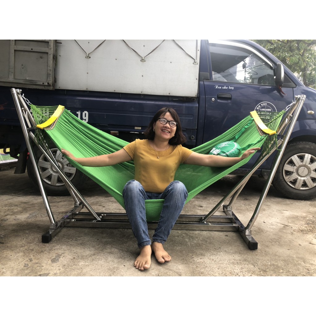 sườn võng xếp inox vuông khung và lướisườn võng xếp inox vuông là cái sườn võng đế vuông phi 40 chất liệu inox 100%, sáng bóng không rỉ sét. ngoài mặt đế vuông vững chắc ko bị rung nảy khi đu đưa võng. Hàng xịn bảo hành 12 tháng.