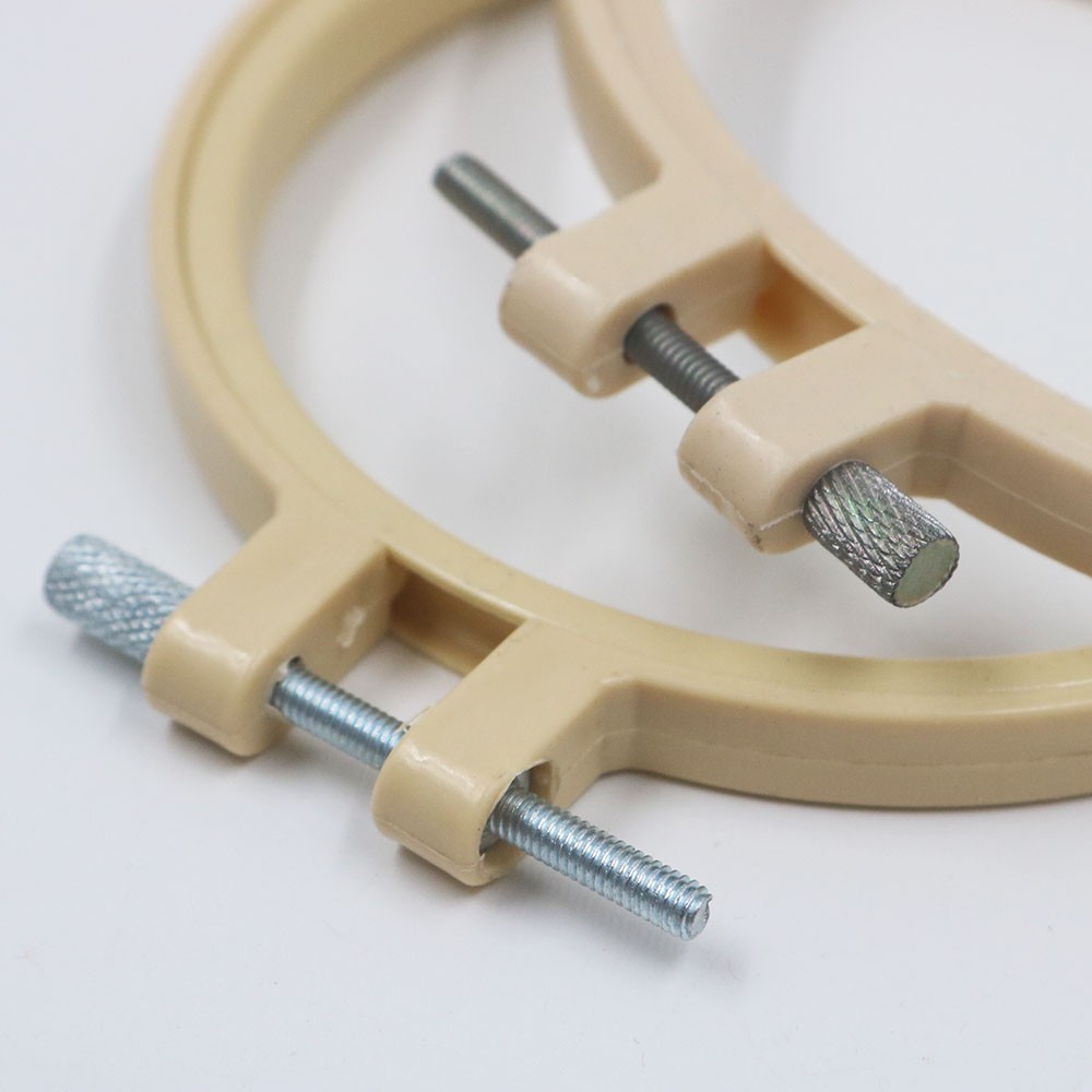 Khung thêu bằng nhựa, màu be, khung cứng cáp, có chốt mạ bạc chắc chắn. 2 khung trong và ngoài có rãnh khớp với nhau giúp căng vải chắc chắn, không bị trơn.Khung dùng để tập thêu hoặc làm khung treo tường.