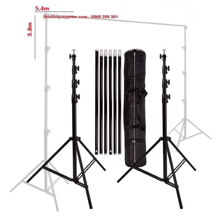 Khung treo phông di động là một trong những phụ kiện không thể thiếu trong mọi studio. Hôm nay thietbiquayphim.com xin giới thiệu tới các bạn một bộ khung treo di động kích thước lớn 3.8×5.4m nhằm giúp treo phông không to để quay hay chụp trong khoảng không gian lớn. Bộ khung giá treo phông được làm từ hợp kim nhôm nhẹ giúp di chuyển cũng như thao tác lắp đặt dễ dàng.THÔNG SỐ KỸ THUẬT: