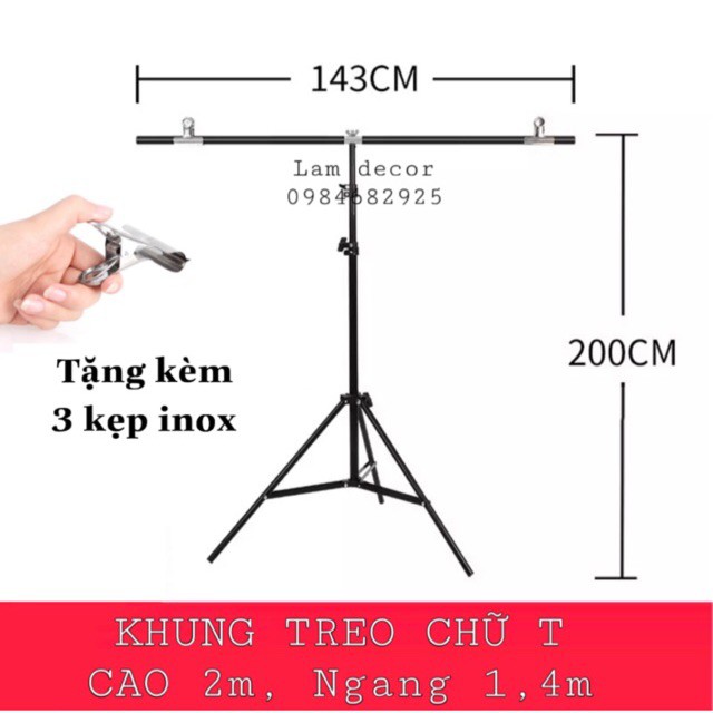 Bộ khung treo phông nền chụp ảnh hình chữ T:Giá đỡ phông nền khung chữ T với thiết kế nhỏ gọn, có 3 chân đứng và 2 kẹp phông nền chụp ảnh chắc chắn thuận tiện.