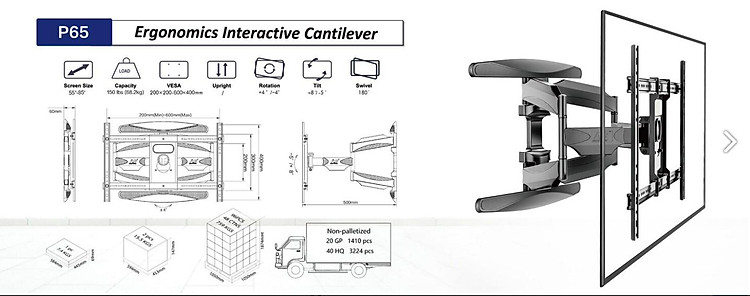 Giới thiệu Khung Treo Tivi XOAY P65 Dành Cho Tivi 55 Inch - 85 Inch Tải Trọng 68.2kg - Hàng Nhập Khẩu - Thiết Kế Tay Đòn Kép Tăng Cường Độ Bền - Sơn Tĩnh Điện Bóng Bẩy -Hàng nhập khẩu